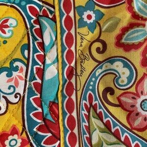 Add a pop of color to your outfit with this vibrant Vera Bradley quilted shoulder bag! Featuring a bold floral paisley print in shades of yellow, red, turquoise, and green, this spacious bag is both stylish and functional. It has sturdy rolled handles, a detachable/adjustable shoulder strap, and a magnetic snap closure. The interior is fully lined with multiple zip pockets for organization.