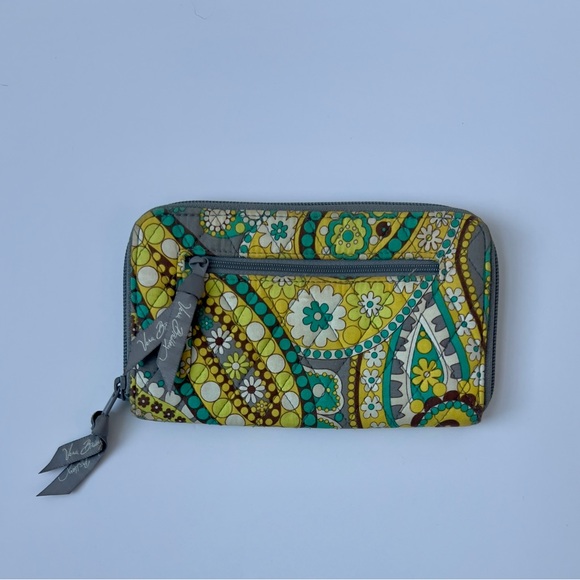 Charming Vera Bradley wallet with floral paisley pattern. Retired lemon parfait. Features green and yellow hues. Ideal for everyday use, travel.