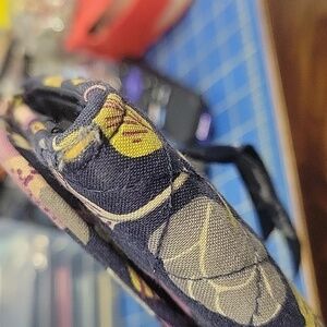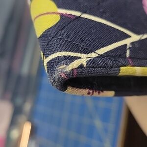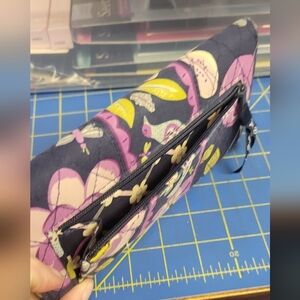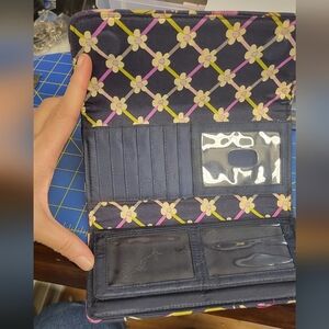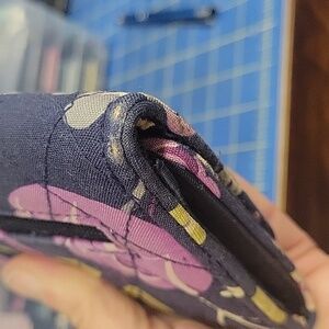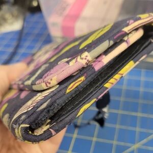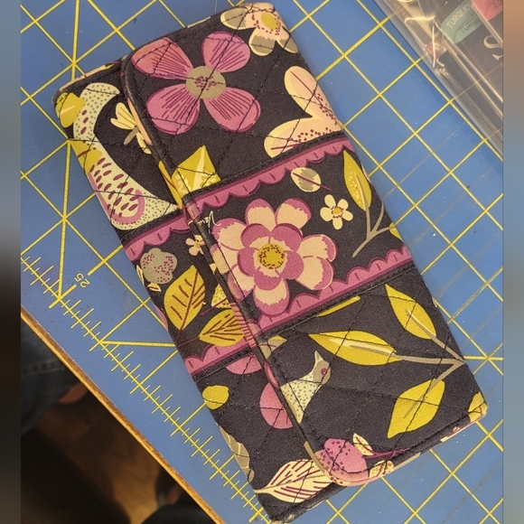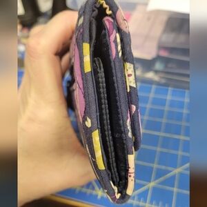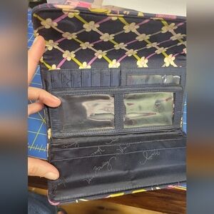 Vera Bradley Stylish wallet with a vibrant floral pattern. Features pink, yellow, and purple flowers on a dark background.