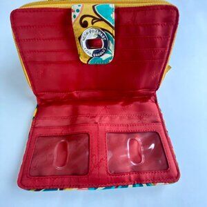 Vera Bradley Floral Quilted Wallet Clutch, 8" wide x 5 " tall. Preowned in good condition. Gentle wear, but no holes, stains, tears or flaws. Multiple compartments for cars and several zipper pouches for phone, etc. Perfect everyday clutch when you dont want to carry a handbag, or for use as a wallet inside a larger bag.