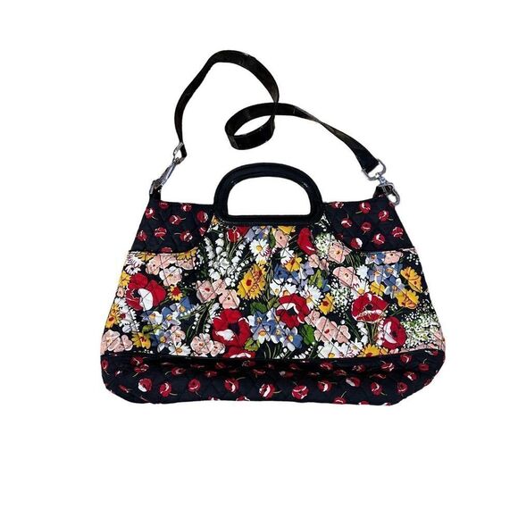 This beautiful shoulder bag from Vera Bradley features a lovely floral pattern that will complement any outfit. With a spacious interior measuring 17 inches in width and 11 inches in height, it's perfect for carrying all your essentials. The bag closes securely with a button and has comfortable cotton handles in black.