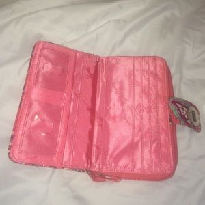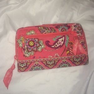 Gorgeous Vera Bradley staple item! Can be used as a roomy wallet or a small clutch. There is room inside the second pocket for small items such as lipstick and gum. Slightly worn, but still in great shape!
