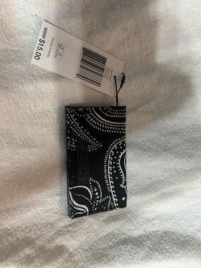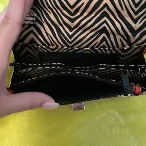 Stylish floral wristlet. Features vibrant red, purple, and white design. Secure clasp closure. Convenient wrist strap.