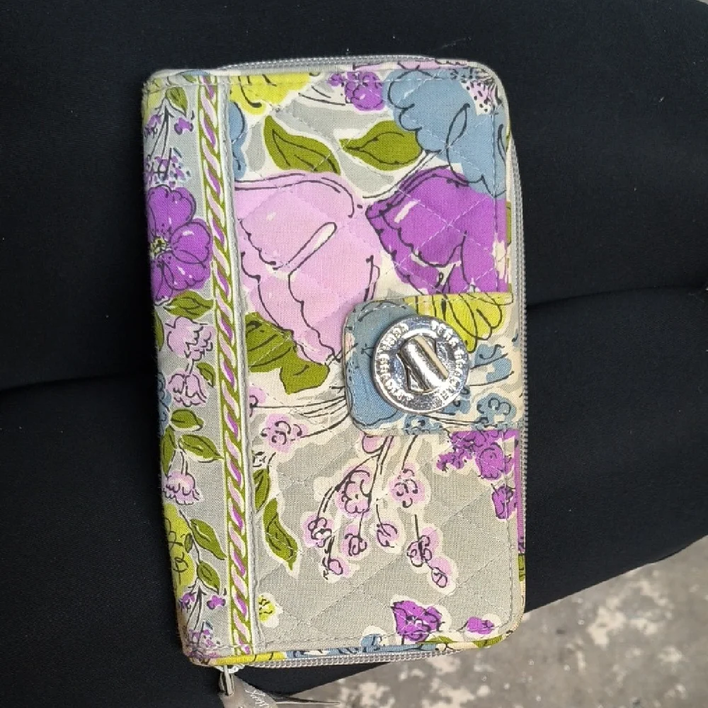 Vera Bradley zip-around wallet with quilted floral print. Features a turn-lock strap detail. Multiple card slots and zip coin pocket inside. Lightweight and easy to carry.