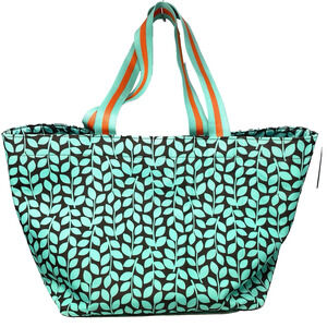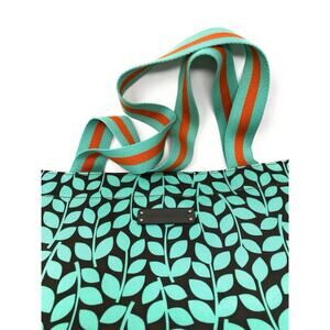 * Featuring a multicolor floral pattern on cotton canvas with aqua handles and lining, this stylish bag has a vibrant and tropical theme.