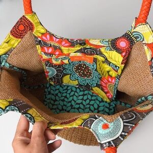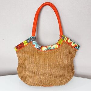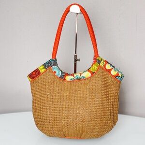A stylish and functional Vera Bradley tote bag, perfect for everyday use. This bag features a woven straw body, offering a natural and textured look. The top of the bag is trimmed with a vibrant floral pattern, adding a pop of color and visual interest. The bag is completed with braided handles, providing a comfortable grip. Inside, the bag is lined with a coordinating floral fabric and includes additional pockets for organization.