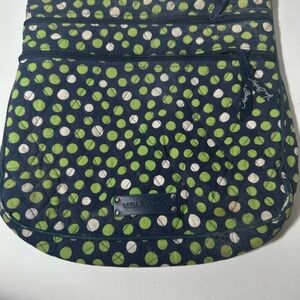 This Vera Bradley crossbody bag showcases a playful green and blue design, perfect for adding a pop of color to your casual outings. Its compact size and adjustable strap make it a convenient choice for hands-free carrying. Crafted from durable fabric, it offers both style and practicality for everyday adventures.
