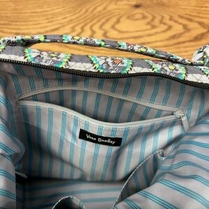 Vera Bradley bag, light, and dark purple, decorative knots, on both sides of purse. Zipper pouch on each side. They are sideways from normal upright pockets. Net pockets on both sides of purse. Both sides are identical on outside, interior has two pouches on one side and a hidden tiny pouch for your keys in the interior, other side of the interior has a zipper compartment. Measurements bottom of the purse is six 3/4” H X 8 3/4” wide. strap is adjustable. A really adorable bag with no flaws just like brand new without any tags. I carried it one time. It has no stains or tears.