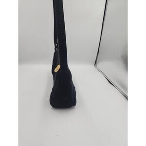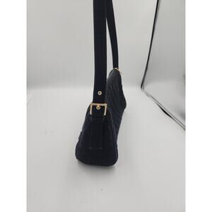 This Vera Bradley shoulder bag is a must-have for any fashion-forward woman. The black quilted fabric exterior is complemented by the matte gold hardware, giving it a classic and chic look. The bag measures 6" in height, 10.5" in length, and 3" in depth, making it a medium-sized tote that is perfect for everyday use.