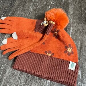 Vera Bradley Hat and Gloves Set Knit Floral Orange Brown Pom Winter