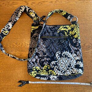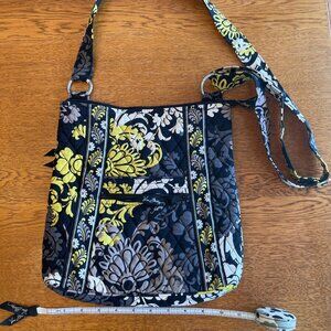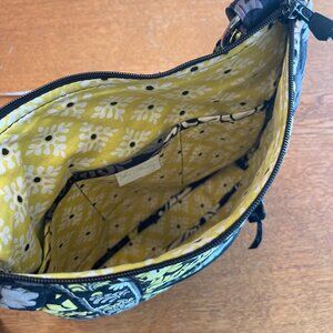 Used, excellent condition, there is an exterior zipper pocket and an open pocket. There are 3 interior slip pockets. Bag has a zipper closure. The shoulder strap is adjustable. Purse is approx 10 1/2 long by 10 inches high.