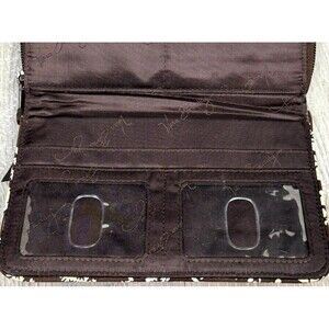 Vera Bradley Imperial Toile bi-fold organizer wallet in neutral brown and cream with pink accent. Signature quilted cotton in botanical tapestry of tropical palms, flowers, hummingbirds, pagoda, and arching garden bridge. Timeless richly detailed scene with jewel-tone pink accent color. Features silver-tone metal branded turn-lock flap that folds open to 8 card slots, 2 clear slots, and checkbook/money holder. Zip around closure with signature branded pull tab opens to a secure dual compartment in rich brown branded lining with money slot and 6 more card slots. Easy access exterior zipper coin purse. Classic designer Vera Bradley quality crafted lightweight utility accessory. Stylish nature print in earth toned quilt cotton compliments bloomcore, cottagecore, and boho chic fashion.