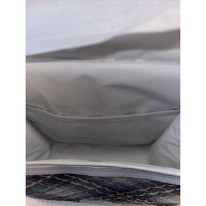 This Vera Bradley Lunch Crossbody is the perfect accessory for any plaid lover. With a cute snowy plaid theme, this lunch tote bag is made of durable cotton and PVC materials and comes in a stylish gray and navy color. The bag features one compartment, a mesh bottle holder, and a handle for easy carrying.