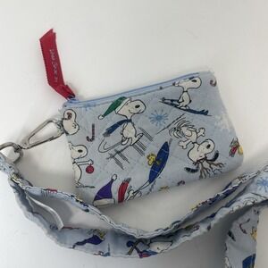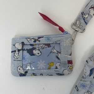 The Vera Bradley Jump Snoopy PEANUTS Limited Edition Wallet is a small, zip closure wallet featuring a charming Snoopy print from the Peanuts series. Made of cotton with a quilted finish, this wallet is part of the Vera Bradley Crossbody Wallet product line and includes a wristlet accessory. The exterior and lining are both multicolor, with blue hardware accents, making it a delightful addition to any winter-themed outfit for women who appreciate unique and stylish accessories.