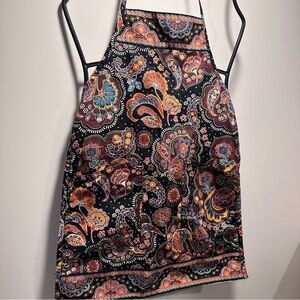 The apron is black with a colorful paisley design in shades of pink, orange, blue, and yellow. It has a tie neck strap and a tie at the waist. The apron also two large pockets at the front.