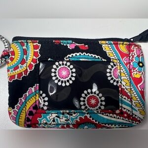Vera Bradley ID coin purse with vibrant paisley design. Features a keyring and clear ID window. Perfect for on-the-go.