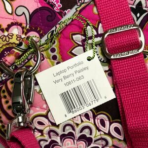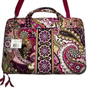 Vera Bradley laptop case. Hard shell covered in Very Berry Paisley fabric. Fits up to 17inch laptop. Includes shoulder strap as well as handles. Has front and back pockets for storage.