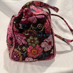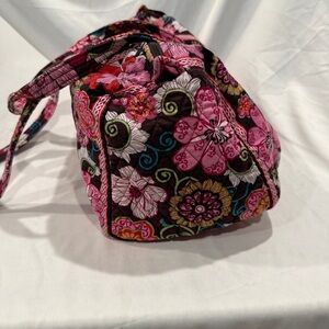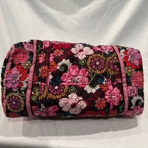 This is a used Vera Bradley Duffel Bag in the Mod Floral Pink pattern. This bag is in very good condition. No stains or tears. The bag has one external open pocket on the side.