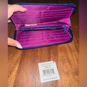 NEW Vera Bradley Laser-Cut Accordion Wallet Emerald Paisley. Interior has a large zipper pocket divider, 2 long bill slots, 1 clear ID window & 12 card slots.