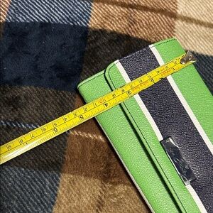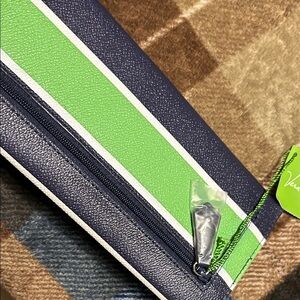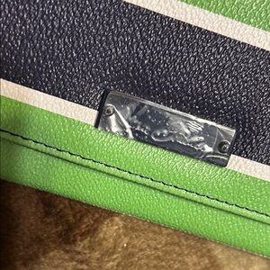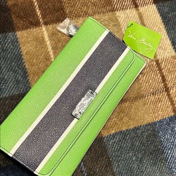 Chic Vera Bradley clutch with lime green and black stripes. Elegant clasp detail.