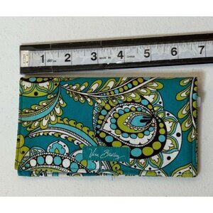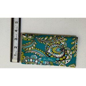 Vera Bradley checkbook cover in the bright Lime’s Up paisley print. Made from quilted cotton fabric in teal, lime, white, and black tones. Interior has two horizontal slip flaps designed to hold standard checkbook and register. Compact, lightweight, and easy to spot in your bag. Excellent preowned condition.