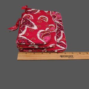 Vera Bradley Set of 3 Makeup Cosmetic Bags in Rosy Posies Fabric. The bags are lined inside. They measure approximately 5 by 4, 6 1/2 by 4 1/4 and 8 1/2 by 6 1/4 inches. The fabric is quilted. They all have a zipper closure and Vera Bradley in silver is on the largest bag. Please view all photos. A ruler is in the last photos for size and scale. These are really pretty and in good shape.