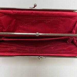 This wallet features a zippered pocket, credit card slip pockets, a bill pocket and room for additional personal items. It is gently used. The closure is snug/secure without being difficult. There is a stitch flaw that you can observe in the picture. It will ship from a smoke free, pet free home. Thank you for your consideration.