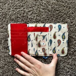This Vera Bradley Euro Wallet features the retired Marina Paisley print with a colorful mix of blues, reds, yellows, and white in the brand’s signature quilted cotton fabric. It measures approximately 5.5 inches long and 4 inches tall when closed, making it compact yet functional for everyday use. The wallet includes 10 card slots total, including a clear ID window, two full-length bill slots, and a zippered coin pocket on the back. It secures with a flap and magnetic snap closure. There is some interior discoloration that appears to be color bleeding from washing, but all compartments are fully functional and intact. A great everyday wallet with classic Vera Bradley charm.