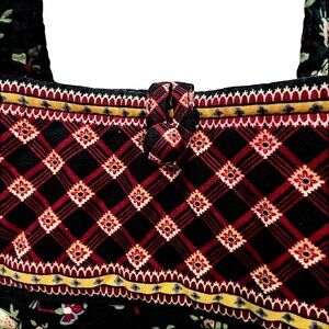 Vera Bradley Medium Tote features a "Anastasia" pattern with cabbage roses design. The rectangular bag has a button closure, double handles with multicolor accents, and a quilted cotton exterior. It includes interior pocket and a multicolor cotton lining. Ideal for travel, parties, or casual outings, this medium-sized tote exudes a charming rose-themed style. ( has some ware on bottom SEE PICTURES 8 & 9)