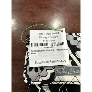 The Vera Bradley Midnight Paisley Wallet Trifold is a new wallet made with quilted cotton and features a black color with magenta paisley pattern. It has a size of S and is designed for women. The wallet includes credit card slots and a folding feature for ease of use. The brand is Vera Bradley and it is made in Vietnam.