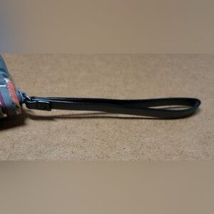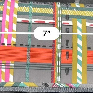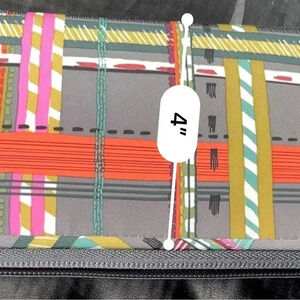 The wristlet features a colorful geometric plaid design on a gray background, made with sleek, water-repellent performance twill fabric.