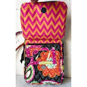 Vera Bradley Mini Hipster crossbody bag in Ziggy Zinnias pattern. Bright floral and paisley pattern in pink, orange, green, grey, white and black. Small bag has zippered main compartment and back slip pocket. Front pocket has a magnetic closure with an exterior zippered pocket and the interior has an id window, credit card slips and a zippered pocket. 6" x 8" x 3/4".