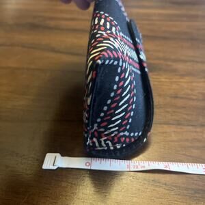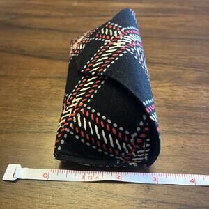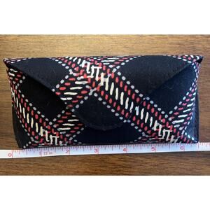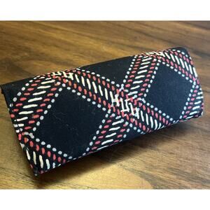 This Vera Bradley eye glasses case can be used for protection and storage of eyewear. Fabric is in Minsk Plaid with black, red, ivory, and gray tones. Snap closure adds ease of access.