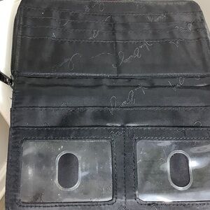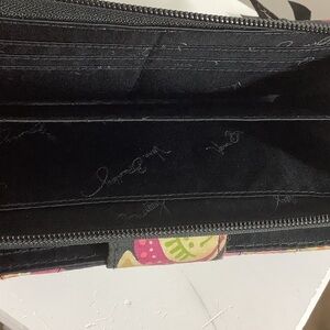 Vibrant Vera Bradley wallet with a lively floral pattern. Features a mix of pink, purple, and green on a black background. Perfect for adding a pop of color.