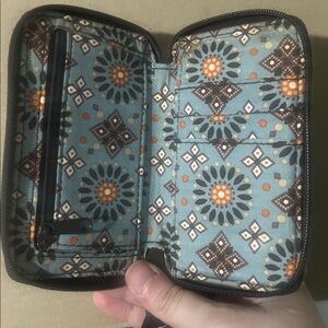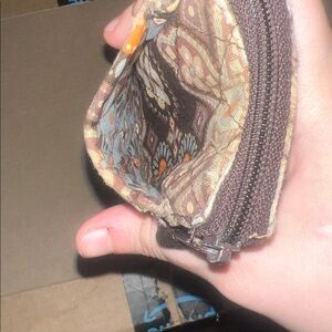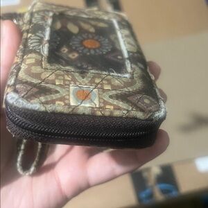 Stylish wristlet with floral design. Features a handy strap for easy carrying. There’s some wear and tear on the front and a little on the back, but other than that it’s in good shape!