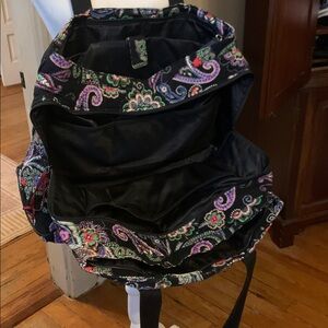 Chic bag with vibrant paisley pattern. Features bold floral accents and a sleek black label.