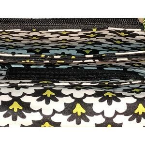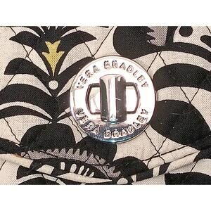 Elevate your accessory game with the Vera Bradley Fanfare Your Turn Lock Wristlet. With its striking black, white floral pattern and a pop of yellow, this wristlet is a perfect blend of style and functionality for the fashion-forward woman. The quilted fabric adds a touch of charm.The wallet measures 6" x 4.7", providing ample space for your credit cards and essentials, all secured with a sturdy turn turn lock closure. Practical and chic, this wristlet is an everyday must-have that embodies the essence of Vera Bradley's thoughtful design and quality craftsmanship.