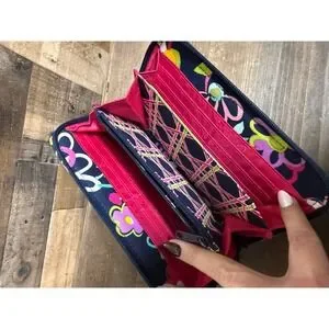 Vera Bradley quilted cotton zip-around wallet in a vibrant navy blue floral pattern with pink, lime green, and yellow accents. This functional accessory features a full zip closure to keep essentials secure, opening to reveal multiple card slots, a zippered coin pocket, and bill compartments. The interior is lined with a coordinating geometric trellis print. A classic lightweight and durable design perfect for daily organization.