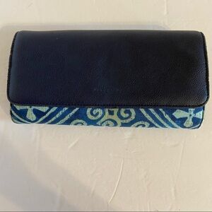 Some staining on the back of the wallet on the fabric. Wear on the bottom corners of the wallet on the fabric. Some wear on the front where the leather meets the fabric. See photos.