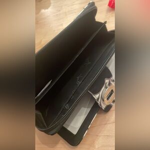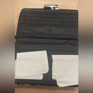 Elegant wallet with a classic black and white pattern. Features a turn lock closure.
