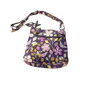 The Vera Bradley Nightingale Bag is a stylish and versatile crossbody bag featuring a beautiful floral pattern on a dark blue quilted exterior. This medium-sized bag is perfect for travel and casual occasions, with a zip closure and multicolor shoulder strap adding a fun pop of color. The gold hardware complements the overall design, making it a chic accessory for any outfit. Made from a cotton blend material, this bag from Vera Bradley is a fashionable choice for women looking for a unique and functional handbag.