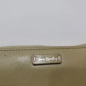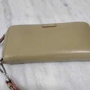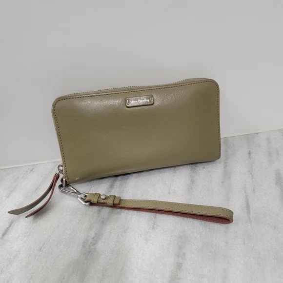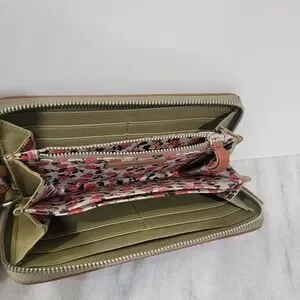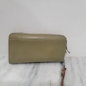 Stylish olive wristlet wallet with a sleek design. Features a convenient wrist strap. adjustable. A few signs of wear (shown in photos) zippered closure. tons of storage space. back storage also.