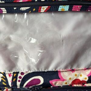 Vera Bradley Hanging Organizer in Painted Paisley pattern is colorful, lightweight and packable. Lotions, powders and sprays all have a home here, thanks to the roomy, gusseted bottom pocket. Navy blue, pink and purple paisley quilted cotton tri-fold travel organizer has fabric tie closure with double carrying handles. Interior metal hanger, three zip pockets and one zip compartment. The top pocket is fabric lined, the middle two are clear plastic and the large bottom pocket is 2" deep with plastic lining. Measurements: 11-1/4" wide x 28-1/2" high hanging. Folded 9" high x 2-1/2" deep. Excellent condition with light wear.
