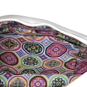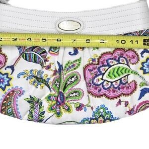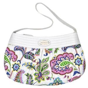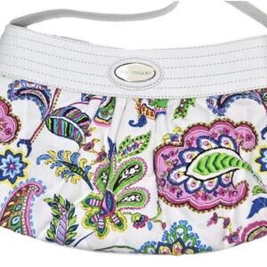 Vera Bradley “Perfect Shoulder Bag” in the Palm Beach Gardens pattern. It is a beautiful bright floral and paisley print. This bag is quilted cotton with white leather trim and shoulder strap. It has the Vera Bradley emblem on the front, and a slip pocket on the back. The inside has a zip pocket and two slip pockets, and closes with a secure zip top.