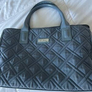 The bag is constructed of a quilted cotton fabric.