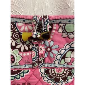 The Vera Bradley Pink Audrey Cupcakes Tote Bag is a stylish and spacious shoulder bag featuring a floral pattern in shades of pink. Made from cotton with a fabric lining, this large bag has a toggle closure and multicolor handles. The vibrant exterior and playful accents make it a perfect accessory for women looking to add a touch of whimsy to their outfit. The brand's signature Vera Bradley style combined with the delightful Audrey design make this tote a must-have for any fashion-forward woman. Tote is 15x17x5. Toggle closure top. Six inside open pockets. One outside open pocket and one outside zipper pocket.