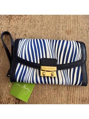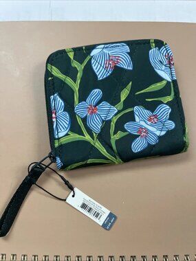 Compact quilted wallet with floral and paisley motifs. Multiple interior slots for cards and cash. Snap-flap closure with branded ribbon pull. Lightweight and travel-friendly.