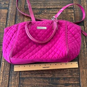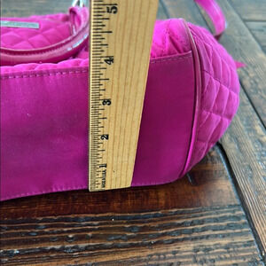 This eye-catching pink shoulder bag by Vera Bradley features a plush diamond quilted pattern, offering both style and functionality. Equipped with top handles and an adjustable shoulder strap, it provides versatile carrying options. The vibrant color and soft material make it a standout accessory for any occasion.