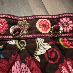 Drawstring backpack with vibrant floral design. Features pink and brown hues. Ideal for everyday use.