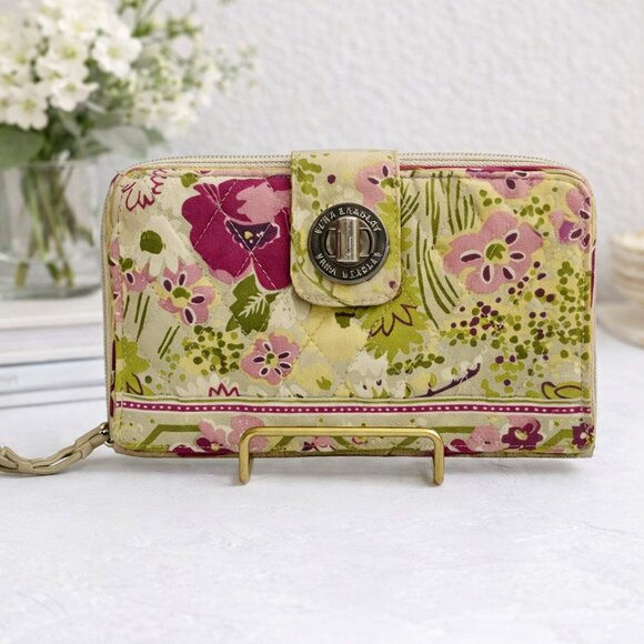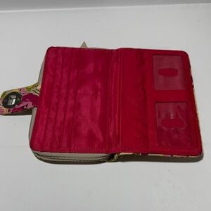 Stylish wallet with floral pattern. Features secure clasp and wrist strap. Ideal for everyday use.